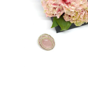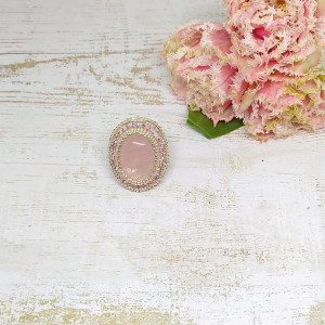 Delikatny kolor kwarcu różowego podkreśly został blaskiem maleńkich różowych kryształków i koralików w kolorze srebrnym (aluminium). Całość umieszczona na obrączce ze stali chirurgicznej i wykończona brązowym zamszem.