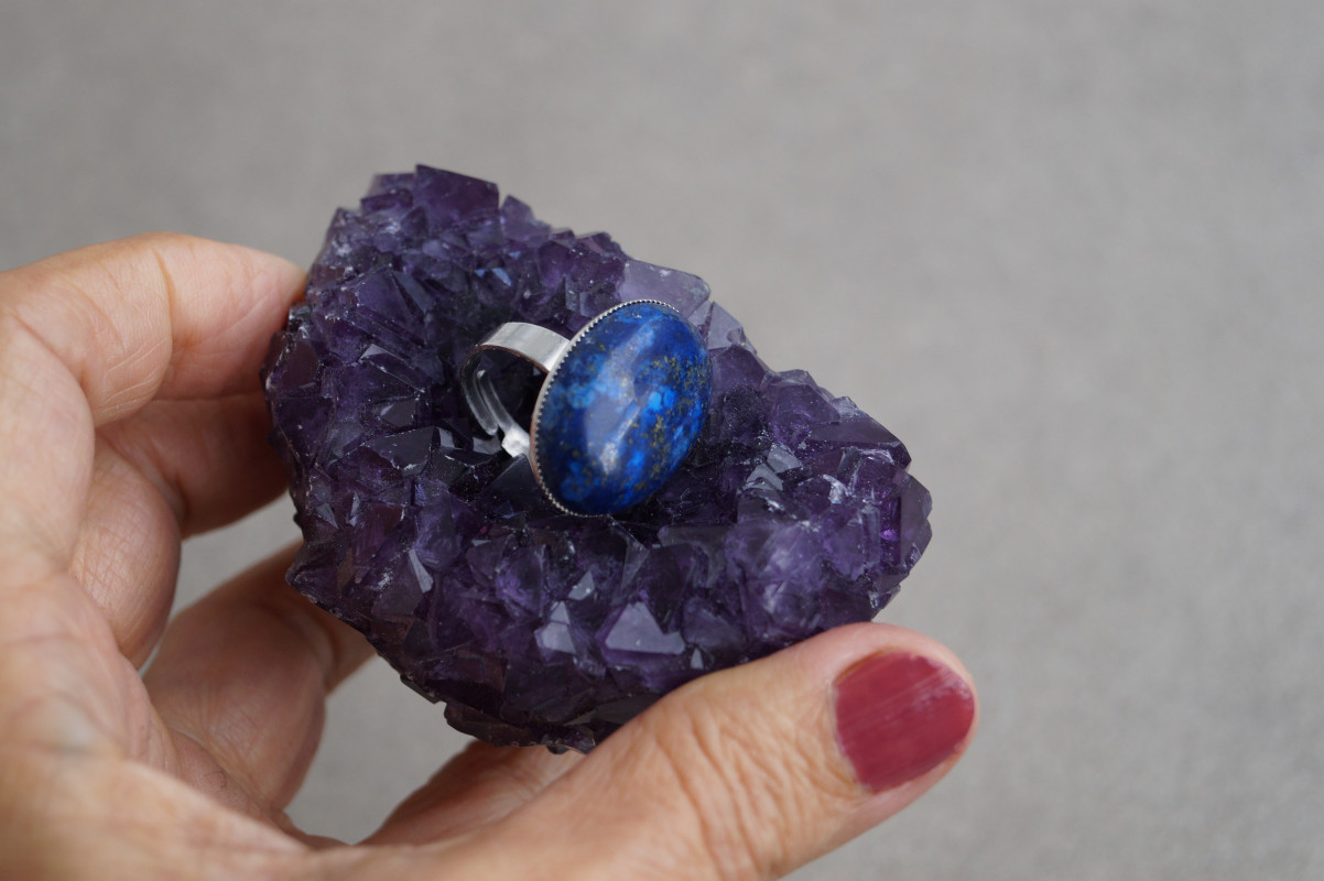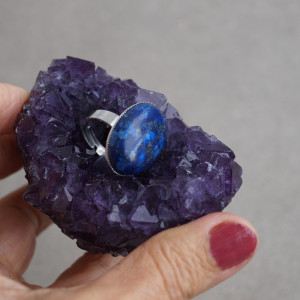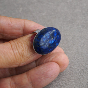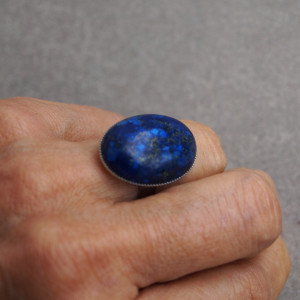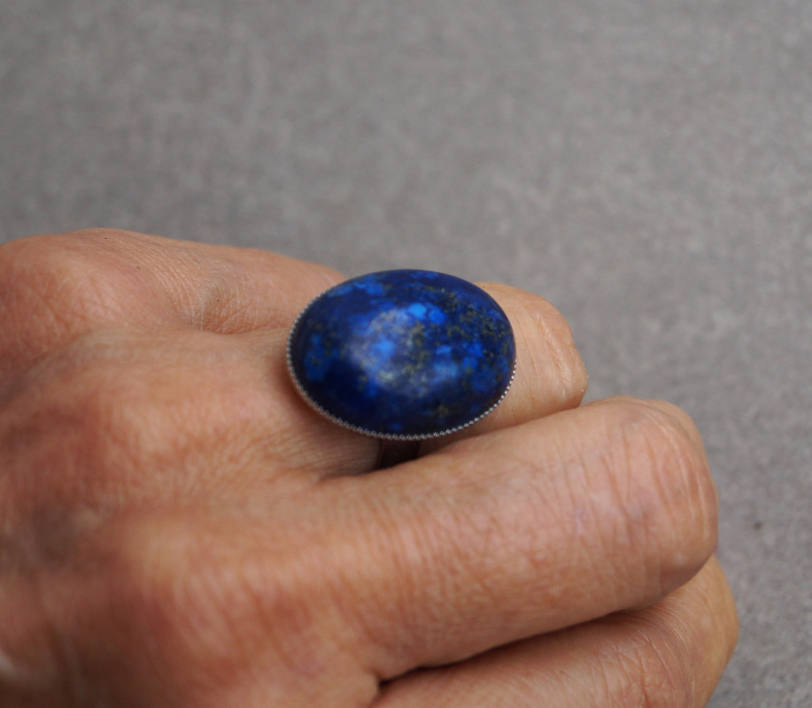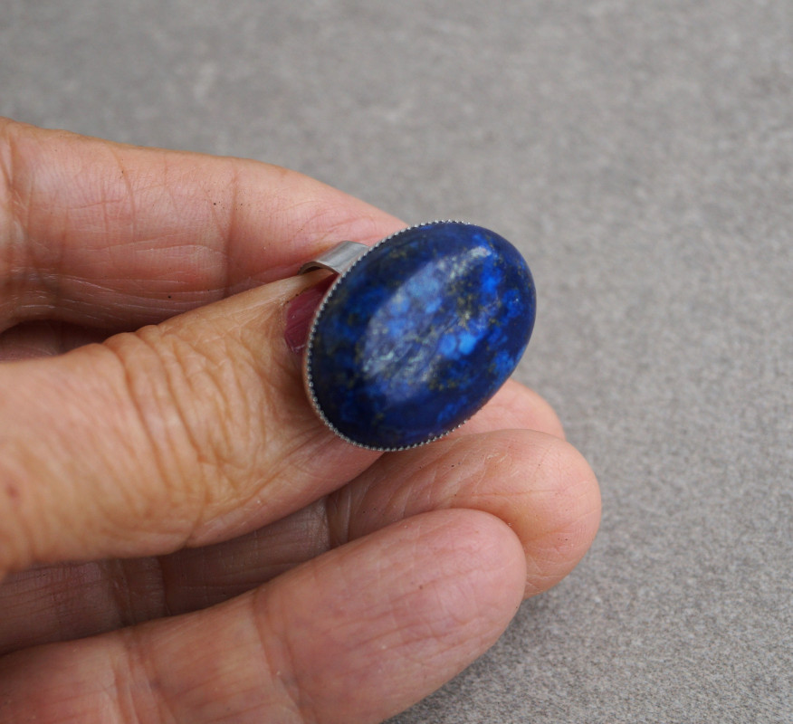 Elegancki pierścionek wykonany z naturalnego kamienia lapis lazuli o wielkości 18–25 mm. Kamień osadzony został w solidnej, regulowanej oprawie ze stali szlachetnej, co gwarantuje trwałość i wygodę noszenia.