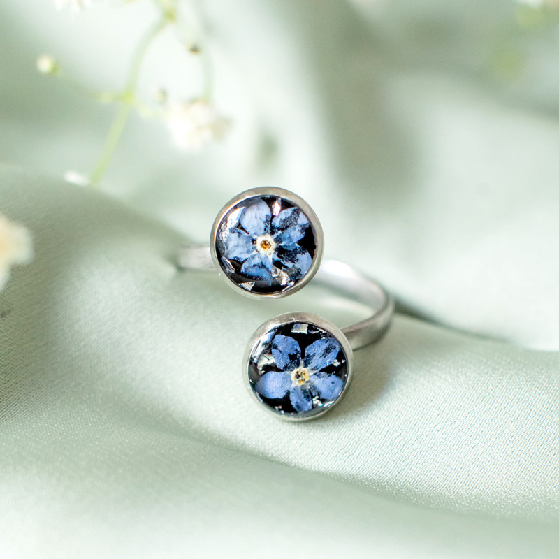 Pierścionek wykonany jest z żywicy epoksydowej z wykorzystaniem suszonych kwiatów. Metalowe elementy to stal nierdzewna szlachetna chirurgiczna.