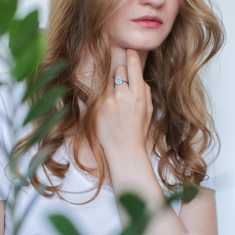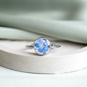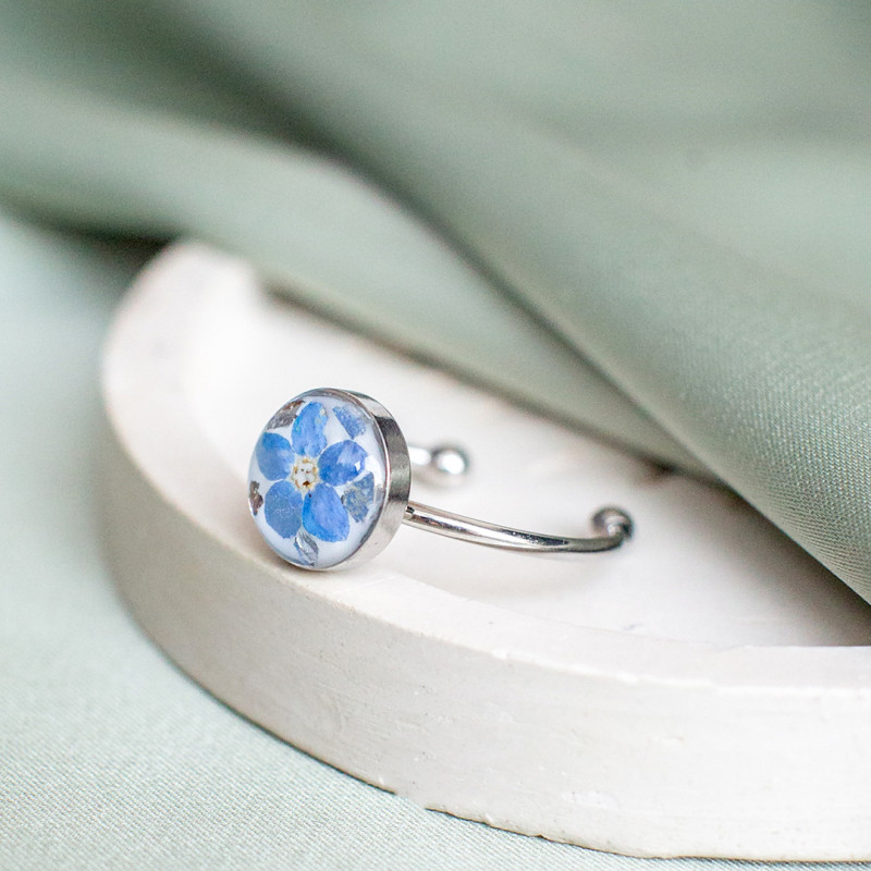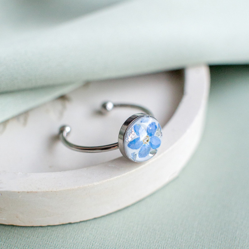 Pierścionek wykonany jest z żywicy epoksydowej z wykorzystaniem suszonych kwiatów. Metalowe elementy to stal nierdzewna szlachetna chirurgiczna.