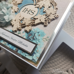 Praca wykonana metodą scrapbookingu, każda z nich jest inna i unikatowa. Jeżeli szukasz wyjątkowej pamiątki dla bliskiej osoby, dobrze trafiłeś/aś, kartka sprawdzi się świetnie jako prezent lub dodatek do prezentu, a zapakowana w pudełeczko będzie efektownym upominkiem.