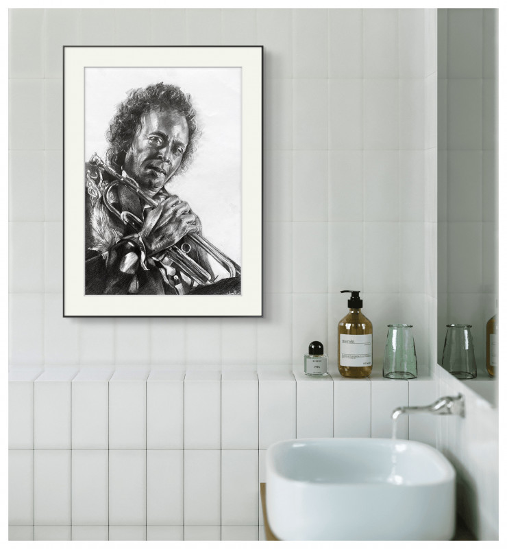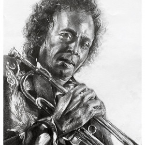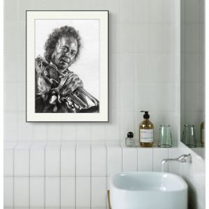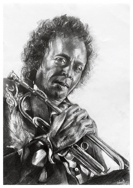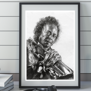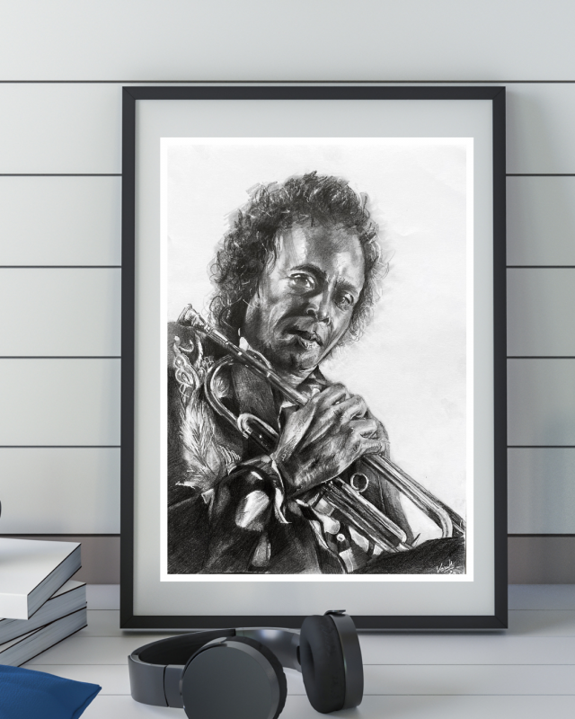 Ten rysunek Milesa Davisa to hołd dla jednego z najwybitniejszych artystów w historii muzyki. Stworzyłem go w ramach cyklu „Ikony”, aby uczcić postacie, które zmieniły naszą kulturę. Miles Davis, znany z rewolucyjnych dokonań w jazzie, został przedstawiony w sposób, który podkreśla zarówno jego charakterystyczny wygląd, jak i głębię jego osobowości.