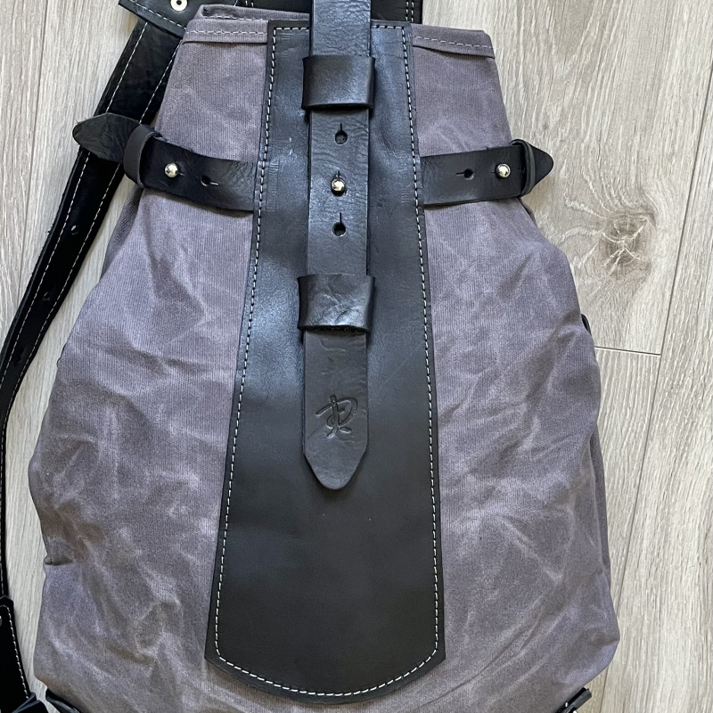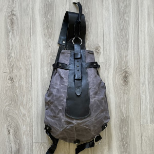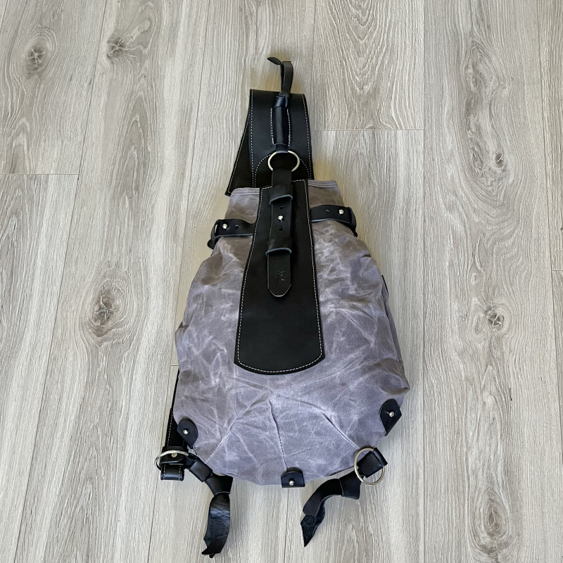 Oryginalny średniej wielkości plecak w kształcie bukłaka na wodę to połączenie woskowanej bawełny Wax Cotton i skóry.