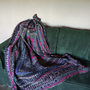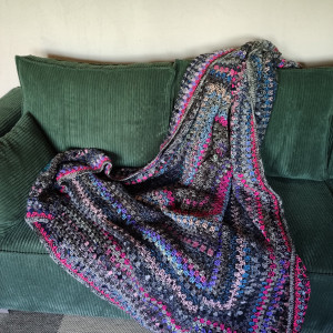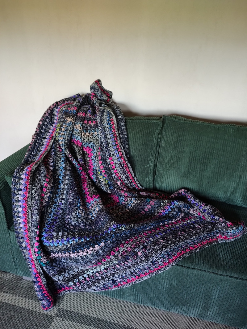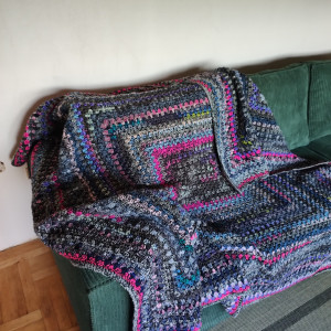 Ten niepowtarzalny pled został wykonany ręcznie na szydełku z włóczek pozostałych po innych projektach – dzięki temu jest absolutnie unikalny i przyjazny dla środowiska. Każdy fragment kryje w sobie historię i różnorodność faktur: znajdziesz tu wełnę, bawełnę, akryl, wiskozę, a nawet nitkę bambusową.