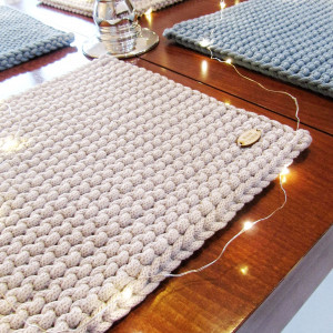 Podkładki stołowe o wymiarze 25/35cm wykonane na drutach z wysokiej jakości sznurka bawełnianego.