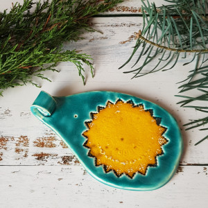 Podstawki zdobione mandalą, która została poszkliwiona żółtym jak słońce szkliwem, reszta w pięknym turkusie.