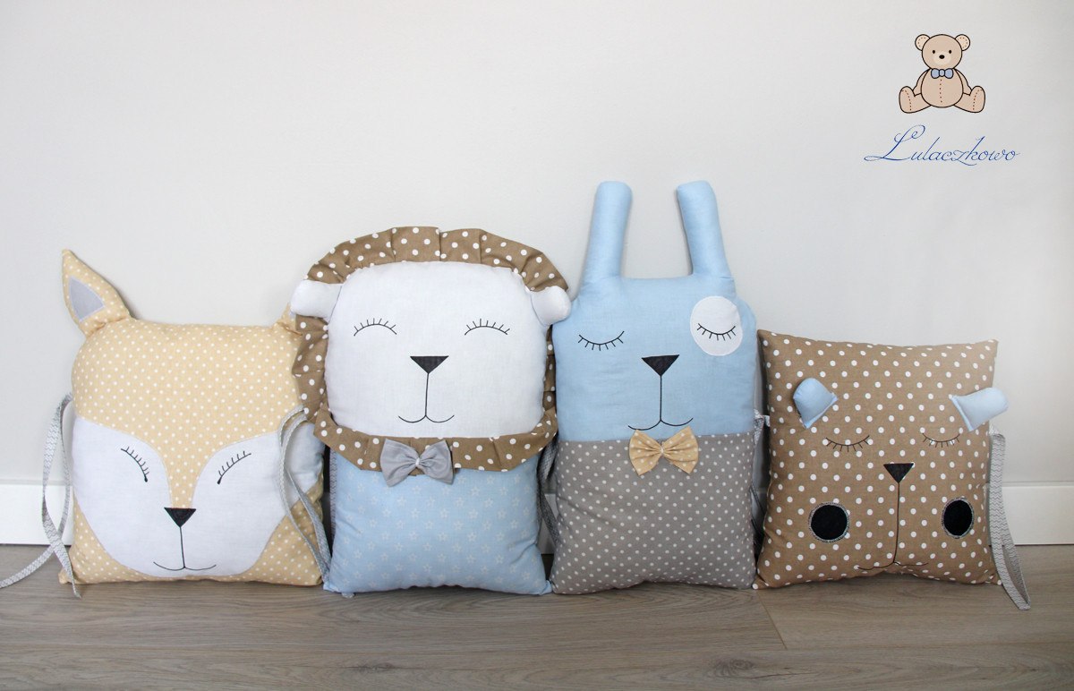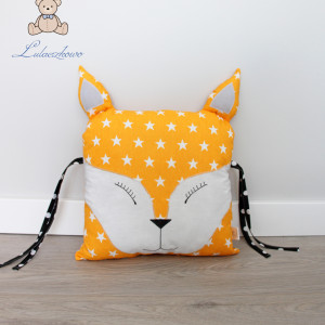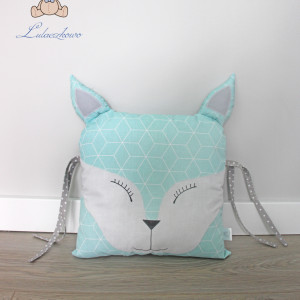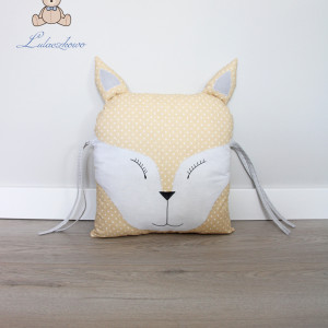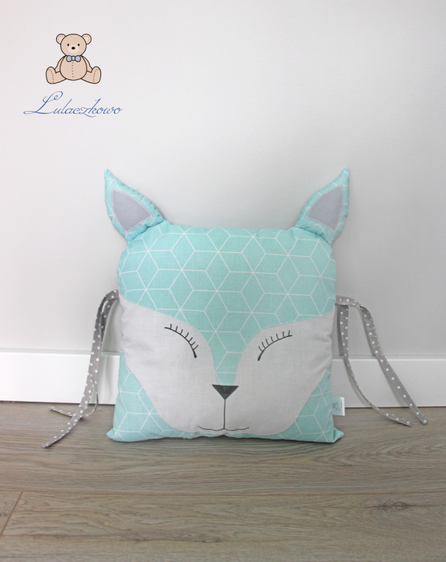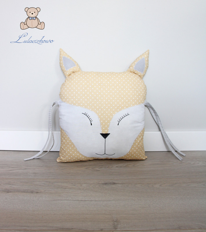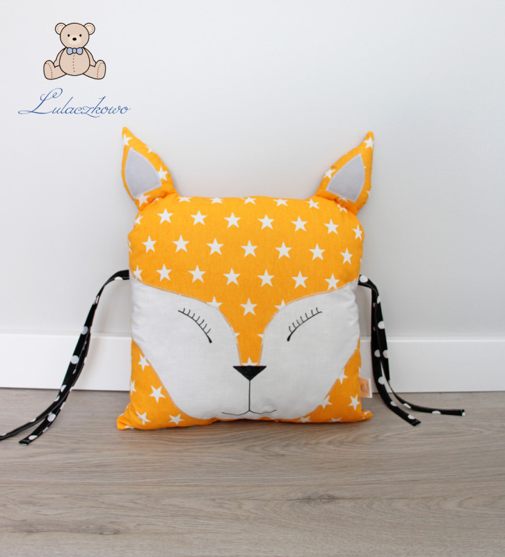 Poduszka ozdobna dziecięca w kształcie liska, moduł do ochraniacza modułowego do łóżeczka dziecięcego. Dostępna w wielu wariantach kolorystycznych. Oferta dotyczy pojedynczej sztuki z troczkami do wiązania bądź bez. Podusia uszyta jest z 100% bawełny i wypełniona antyalergiczną kulką silikonową. Oczka i nosek malowane wodoodpornym markerem do tkanin. Może być zarówno śliczną ozdobą dziecięcego pokoju, ochroną dla dziecka, jak również przytulanką.