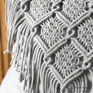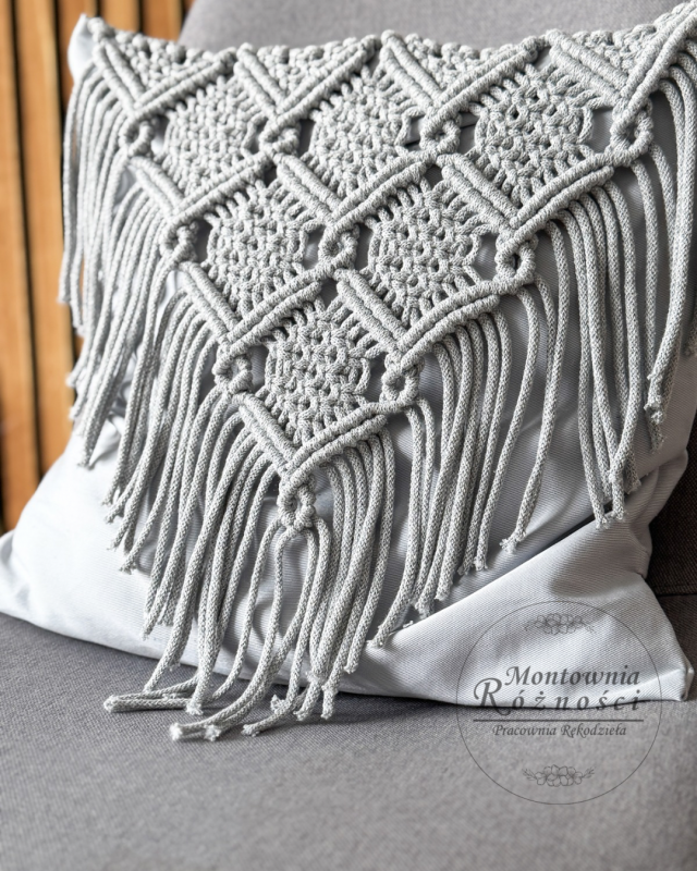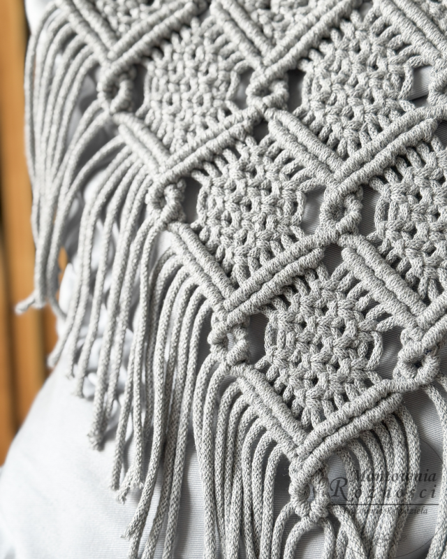 Ręcznie wykonana makrama naszyta na poszewce, dodaje unikalnego uroku i oryginalności.