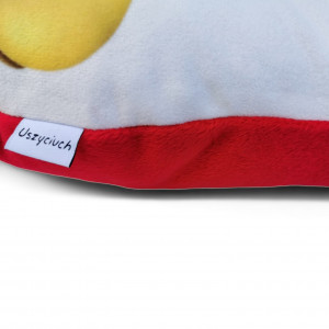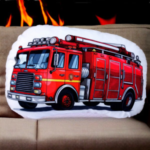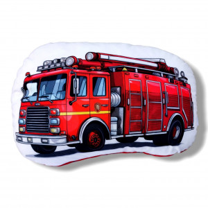 Stylowa ozdobna poduszka uszyta z mikrofazy z wzorem straży pożarnej i z mięciutkiego polaru minky w kolorze czerwonym.