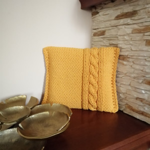 Poduszka z wkładem 40cmx40cm. Poszewka wykonana na drutach, z polskiego sznurka bawełnianego 5mm. Jest zdejmowana, zapinana na guziki kołki. Wkład z kulki silikonowej.