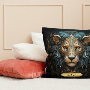Stylowa ozdobna poduszka znak zodiaku uszyta z mikrofazy z nadrukowanym wzorem i z mięciutkiego gładkiego polaru minky w kolorze czarnym.