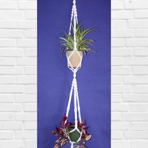 Makramowy, pleciony kwietnik do zawieszania, który doda uroku każdemu wnętrzu. Wykonany został z bawełnianego sznurka z poliestrowym rdzeniem. Do zawieszania służy kółko z surowego drewna.