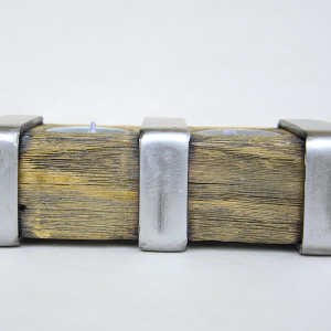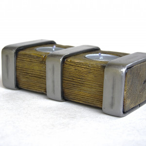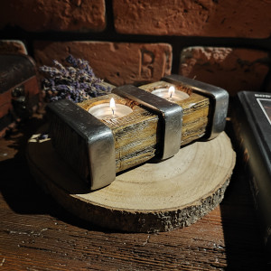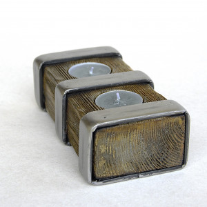 Świecznik na 2 tealighty o industrialnym, surowym wyglądzie, wykonany z kawałka drewna z odzysku o wyraźnej fakturze i widocznych słojach, co nadaje mu naturalny charakter. Drewno jest osadzone w metalowych obejmach, które nie tylko dodają stylu, ale też wzmacniają konstrukcję świecznika, nadając mu wyrazistości i oryginalności. Całość zachowuje minimalistyczną estetykę, idealną do wnętrz w stylu loftowym, industrialnym lub rustykalnym, gdzie proste formy i naturalne materiały odgrywają kluczową rolę w budowaniu klimatu.