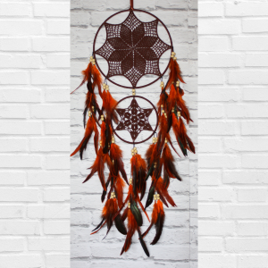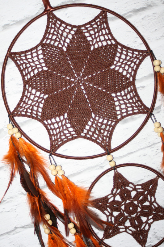 Duży, wykonany na szydełku, łapacz snów. Idealny akcent do sypialni dziewczynki, pomysł na prezent dla kobiety lub na wyposażenie nowego mieszkania. Można go zawiesić na ścianie, lub na oknie. Wykonany ręcznie z akrylowej nici. Jako zawieszka służy satynowa wstążeczka.
