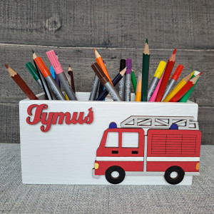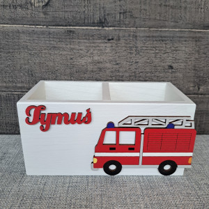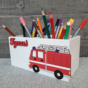 Przybornik został przez nas pomalowany na kolor szary a jego dodatkową ozdobą jest dekor wozu strażackiego oraz imię dziecka, które należy podać przy składaniu zamówienia.