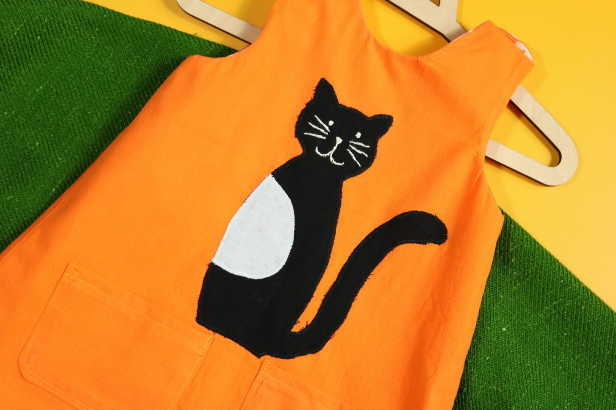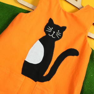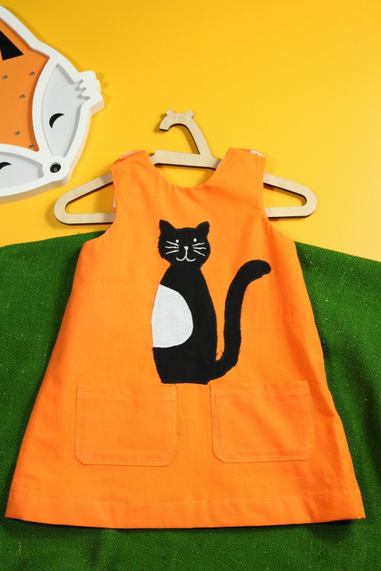 Sukienka wykonana w całości z bawełny (zdekatyzowanej przed uszyciem – sukienka nie skurczy się po praniu). Zapinana na guziki z obu stron, na każdej z nich naszyte także dwie kieszonki. Na pierwszej stronie naszyta aplikacja z kotkiem.