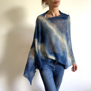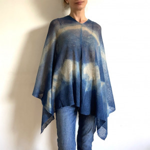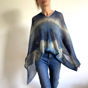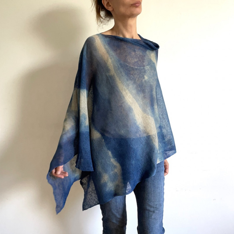 Unikatowe ręcznie barwione ponczo ze 100% lnu wysokiej jakości. Uniwersalne na każdą sylwetkę i rozmiar. Na dzień do dżinsów i na wieczorne wyjście do eleganckiej sukni. W letnie dni ochroni przed słońcem, wieczornym chłodem, czy nadmorskim wiatrem. Możesz szybko zarzucić go jako ponczo, szal, czy bluzka, a nada stylu każdemu strojowi. Wspaniały upominek dla drogiej osoby.