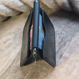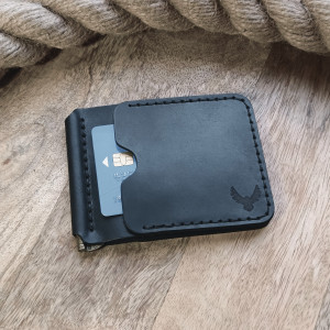 Czarny skórzany portfel z klipsem na banknoty. Uszyty ręcznie z wysokiej jakości skóry naturalnej.