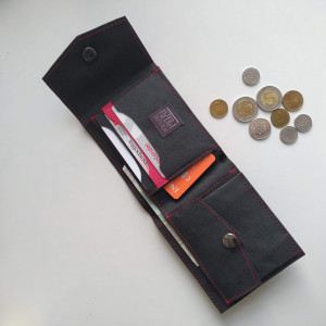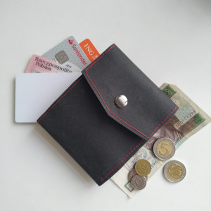 Jest mały, poręczny, wygodny i całkiem sporo mieści. Posiada trzy sloty na karty plus dodatkową przestrzeń pod nimi jeśli potrzebujesz mieć ich przy sobie więcej, posiada również komorę na banknoty i kieszonkę na bilon a całość zapinana jest na zatrzask.