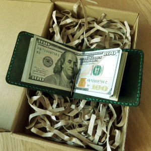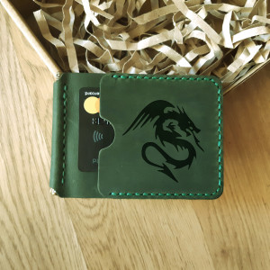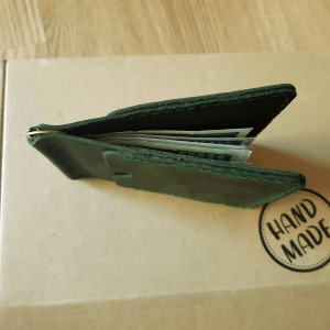 Portfel zielony skórzany z klipsem na na banknoty. Uszyty ręcznie z wysokiej jakości skóry naturalnej.
