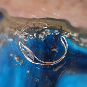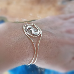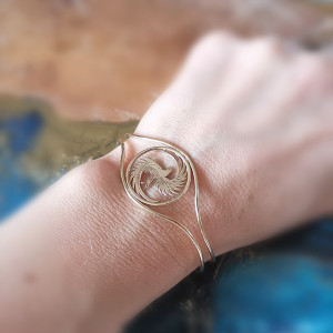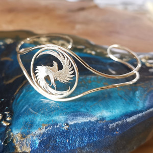 Unikatowa bransoleta otwarta z feniksem, wykonana w srebrze próby 925, pozłacanym. Wygodna w noszeniu. Obręcz z feniksem ma średnicę 25mm.
