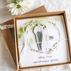 Na przodzie przestrzennie przyklejona postać pary Młodej oraz gałązki
