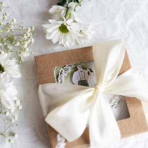 Cudownie elegancka kartka z okazji Ślubu w pudełku, a całość przewiązana kokardą.