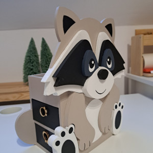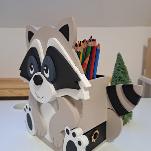 Większy frontu powstał po to, aby zasłonić różnorodne akcesoria szkolne jakie posiadają nasze dzieci z równoczesnym pomieszczeniem ich w jednym miejscu. Dzięki temu biurko wygląda na uporządkowane. Organizer na biurko – Szop wycięty jest z sklejki brzozowej oraz wymalowany farbami z atestem, które posiadają certyfikat na zgodność z normą PN-EN 71-3 Bezpieczeństwo zabawek.