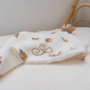 Przytulanka została wykonana z niezwykle miłej w dotyku tkaniny muślinowej połączonej z ręcznie szydełkowanym misiem.