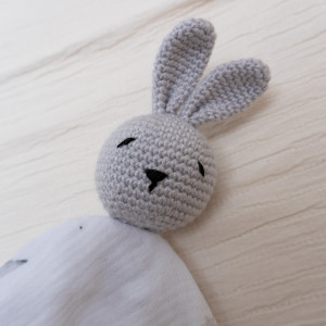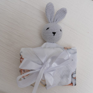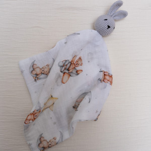 Przytulanka została wykonana z niezwykle miłej w dotyku tkaniny muślinowej połączonej z ręcznie szydełkowanym misiem.