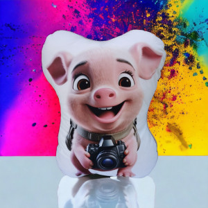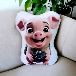 Stylowa ozdobna poduszka uszyta z mikrofazy z wzorem świnki i z mięciutkiego polaru minky w kolorze beżowym.