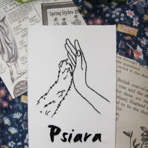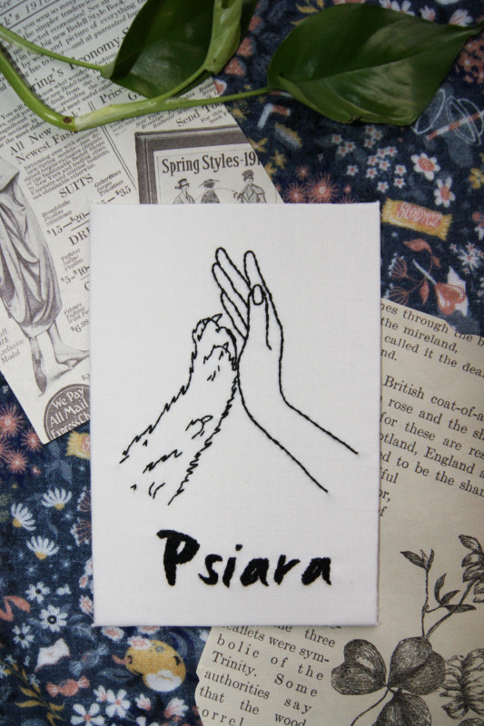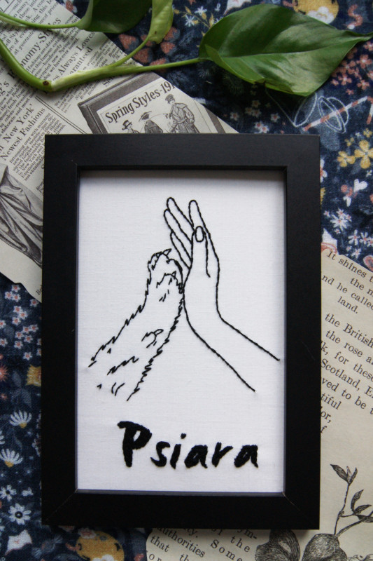 Haft wykonany ręcznie na materiale bawełnianym, usztywniony tekturą o wymiarach 10x15cm. Oprawiony w ramkę z tworzywa MDF. Ramka ma z tyłu haczyk oraz podpórkę, dzięki której możesz wyeksponować ją w dowolny sposób. Choć nie jest widoczna na zdjęciach, do ramki dołączona jest również szklana szybka, która ochroni haft przed uszkodzeniem czy zabrudzeniami.