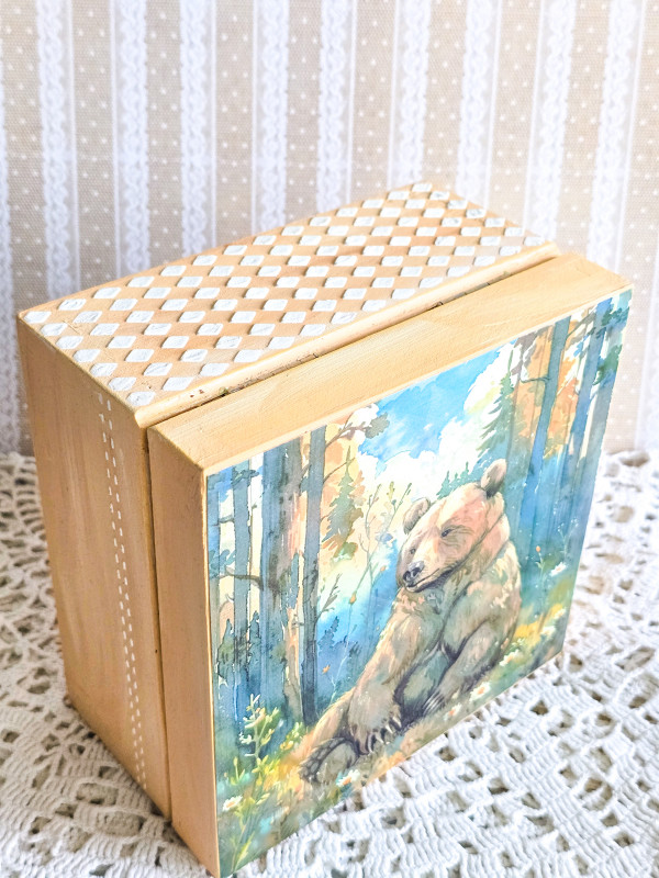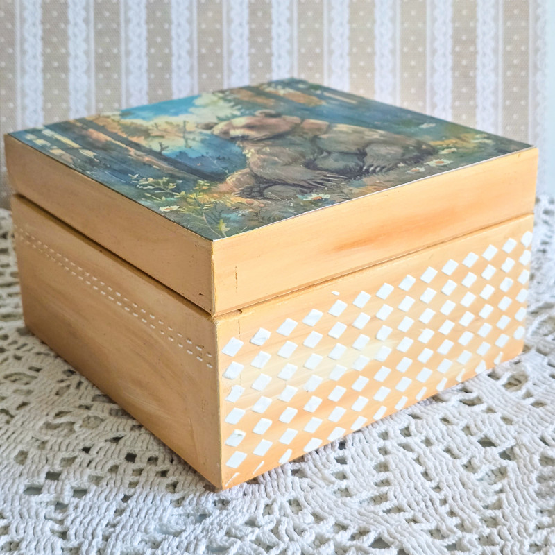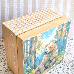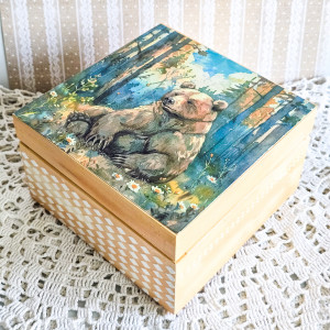 Na wieczku widnieje piękny misiu w lesie