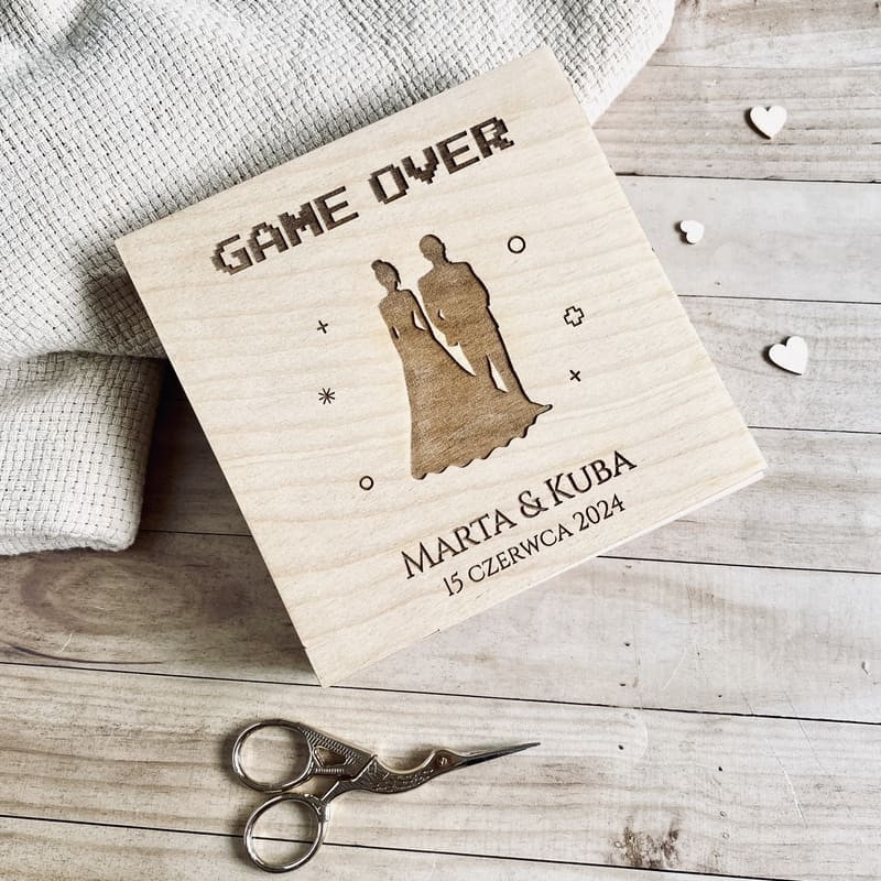 Pudełko drewniane grawerowane z życzeniami oraz wstążką do umieszczenia pieniędzy