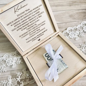 Pudełko drewniane grawerowane z życzeniami oraz wstążką do umieszczenia pieniędzy