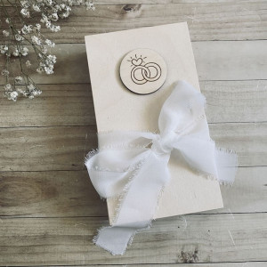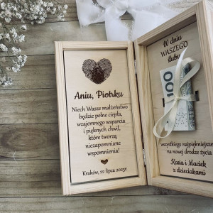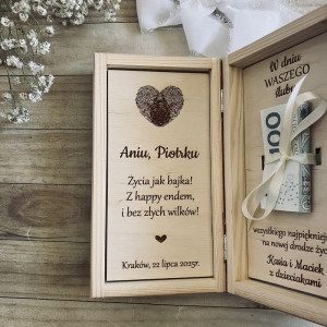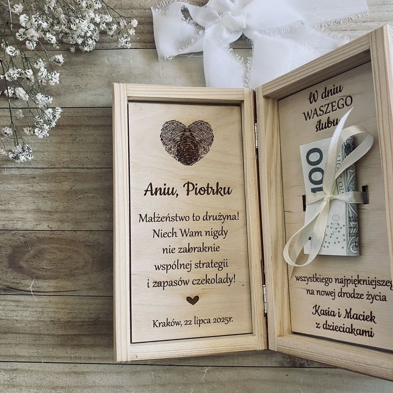 Pudełko drewniane z życzeniami oraz wstążką do umieszczenia pieniędzy. Z zewnątrz przewiązane wstążką