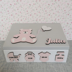 Wieczko pudełka pomalowane zostało na jasno szary kolor a jego ozdobą jest namalowany przez naszych plastyków miś z balonikiem oraz imię dziecka. Spód pudelka jest w kolorze białym i znajduje się na nim metryczka w kolorze pudrowego różu.