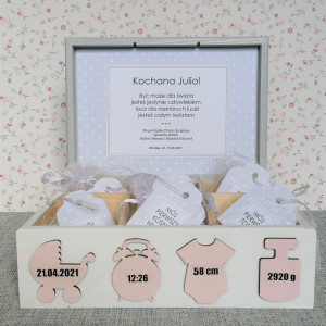 UWAGA: wyposażenie pudełka nie zawiera : smoczka, świeczki i bucika- są to rekwizyty na potrzeby sesji zdjęciowej .