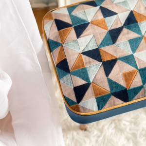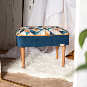 Tapicerowana pufa w kształcie prostokąta. Na siedzisku zastosowana tkanina welurowa z nadrukiem w kolorowe trójkąty z efektem 3D. Na boku pufy użyty matowy welur w ciepłym odcieniu granatu. Całość przełamana lamówką w miodowo – złotym odcieniu.
