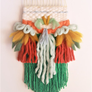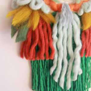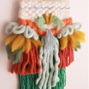 Ręcznie tkana ozdoba ścienna wykonana z wełny czesankowej merynosa oraz wełen przędzonych i tkanin bawełnianych.