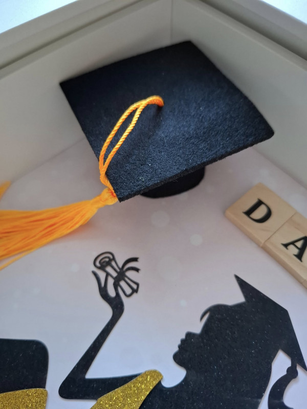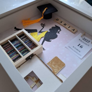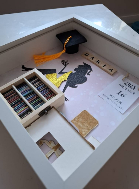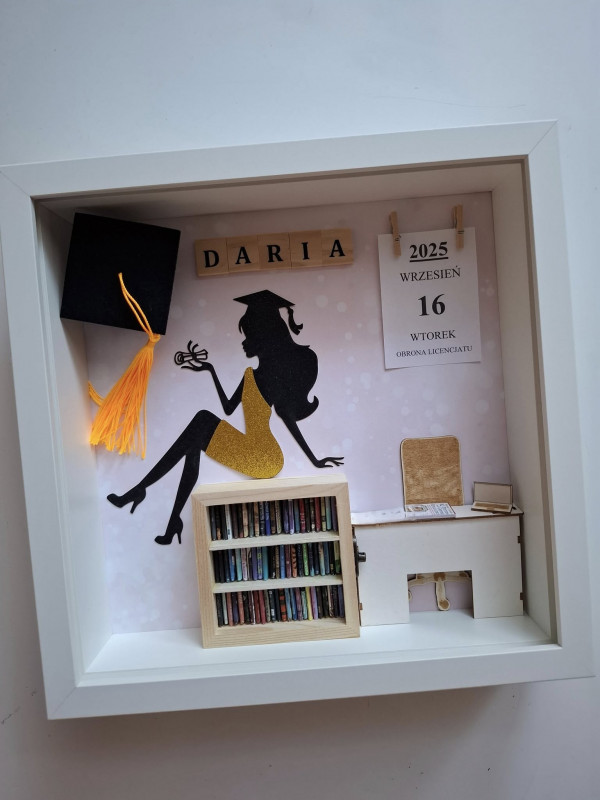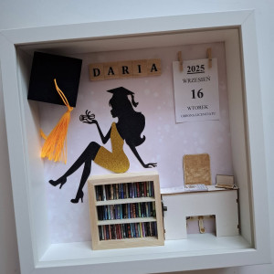 Ręcznie wykonana ramka 3D na ukończenie studiów to subtelny, kobiecy prezent dla absolwentki – na obronę licencjatu lub inny ważny akademicki finał. Stylowa postać w birecie, delikatne detale i personalizacja sprawiają, że ramka opowiada konkretną historię – jej historię.