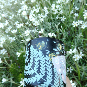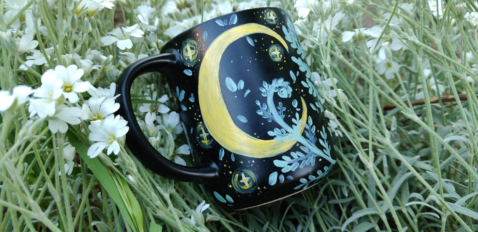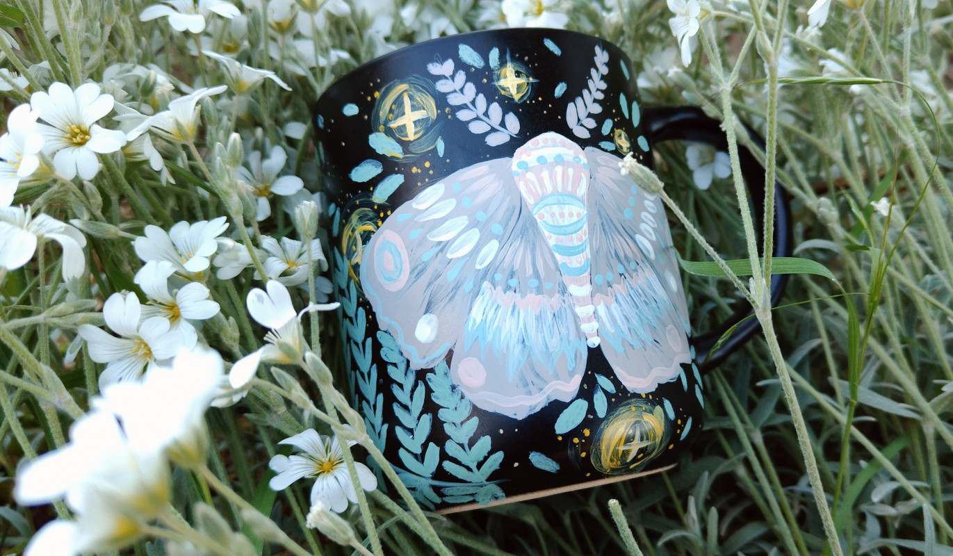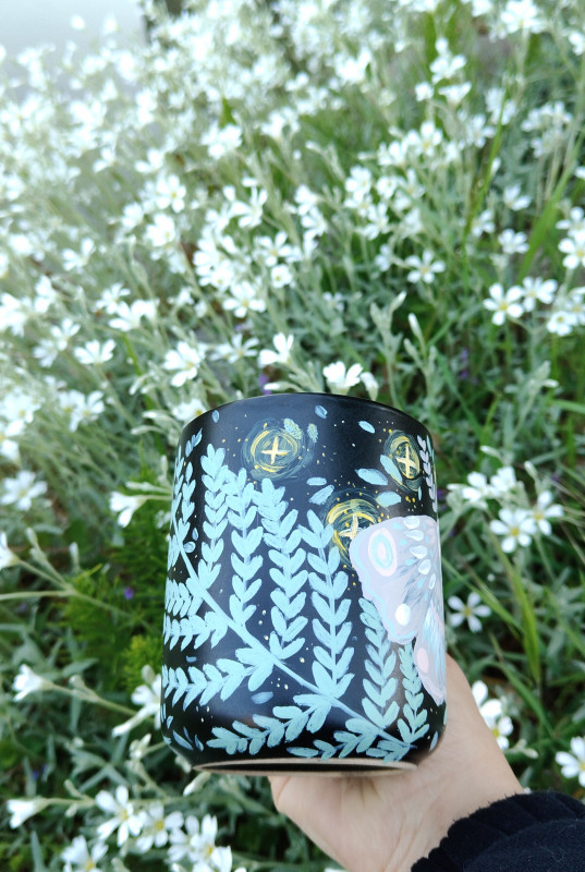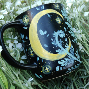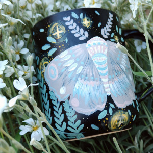 Ręcznie malowany kubek motywem ćmy, paproci i księżyca. Został on wykonany przy użyciu wysokiej jakości farb porcelanowych i wypalony w wysokiej temperaturze.
