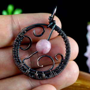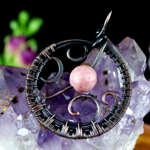 W stylu Boho, misternie pleciony wisior z fasetowaną kuleczką rodochrozytu. Wisior zaprojektowany i wykonany przeze mnie od podstaw bardzo pracochłonną i precyzyjną techniką wire-wrapping z patynowanej miedzi. Wymiary: wysokość: 4.3 cm szerokość: 3.2 cm Na tej aukcji kupujesz wisior ze skórzanym rzemykiem o długości 55 cm. Biżuteria zostanie zapakowana w ozdobne pudełeczko.