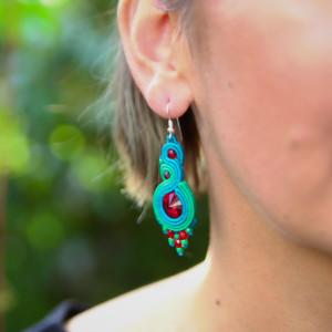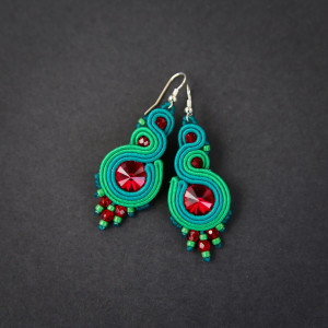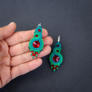 Ręcznie wyhaftowane z kolorowych pasm sutaszowych, ze szklanymi koralikami.