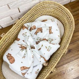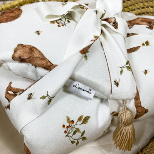 Tkanina bambusowa jest niezwykła przyjazna dla dzieci, delikatna i miła w dotyku, posiada wiele pozytywnych właściwości: * bardzo dobrze wchłania wodę (kilkukrotnie lepiej niż bawełna) przy tym szybko schnie co zapobiega namnażaniu bakterii, * ma wysoką przepuszczalność powietrza, dzięki czemu jest świetna na ciepłe dni, * jest antyalergiczna, antybakteryjna raz antygrzybiczna, może być używana przez dzieci z AZS, * bardzo wytrzymała, * termoregulacyjne, * zatrzymuje promieniowanie UV. Tkanina posiada certyfikaty bezpieczeństwa OEKO-TEX, jest bezpieczna dla najmłodszych. Należy prać w 30 stopniach C, nie wirować, nie stosować wybielaczy, prasować w temperaturach do 100 stopni C, nie suszyć w suszarce bębnowej. Materiał z wiskozy bambusowej ulega lekkiemu pilingowaniu, nie podlega to reklamacji. Należy wziąć pod uwagę, że zdjęcia produktów są zdjęciami poglądowymi. Produkt w rzeczywistości może nieco odbiegać kolorem i układem wzoru. Materiał z wiskozy bambusowej ulega pilingowaniu, nie podlega to reklamacji. Tkanina bambusowa użyta do produkcji kołdry jest poddawana jednokrotnemu zmiękczeniu przez co jest bardziej wytrzymała, ale także twardsza twardsza niż "klasyczna" tkanina bambusowa. Rożek wykonany w Polsce.