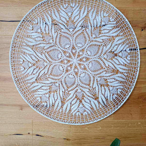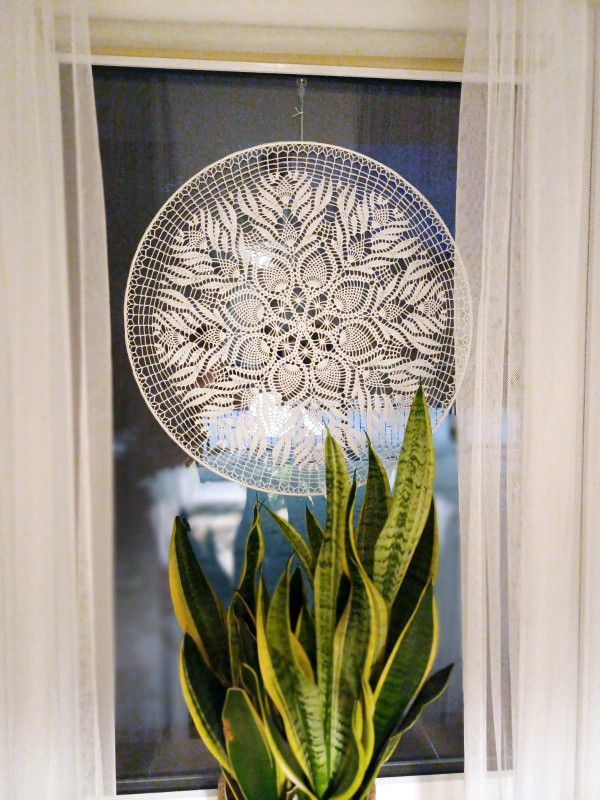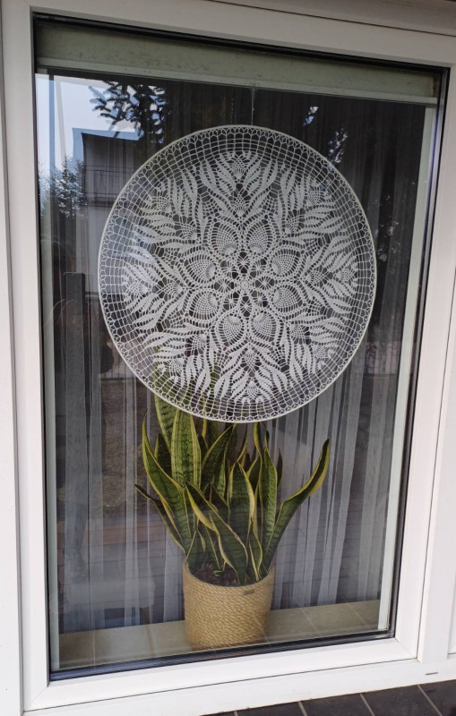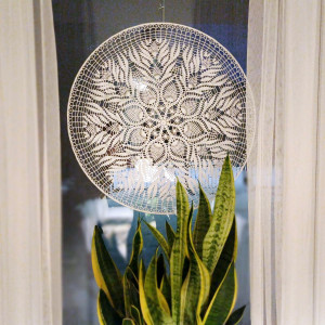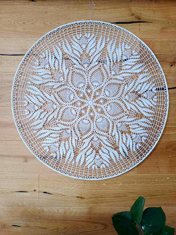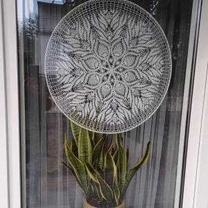 Rozeta wykonana na szydełku z nici w kolorze białym, naciągnięta na metalowej bialej obręczy.