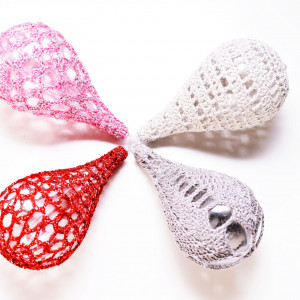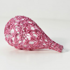 Bombka na wypełnieniu akrylowym o długości 9 cm, wykonana szydełkiem z kordonka poliestrowego YarnArt Camellia według projektu Aurelia Myszka Szara.