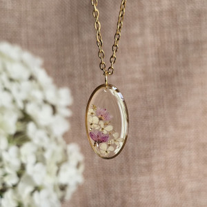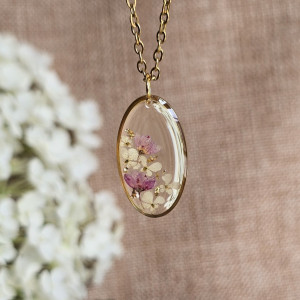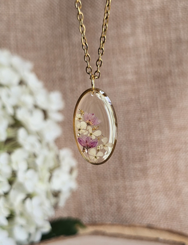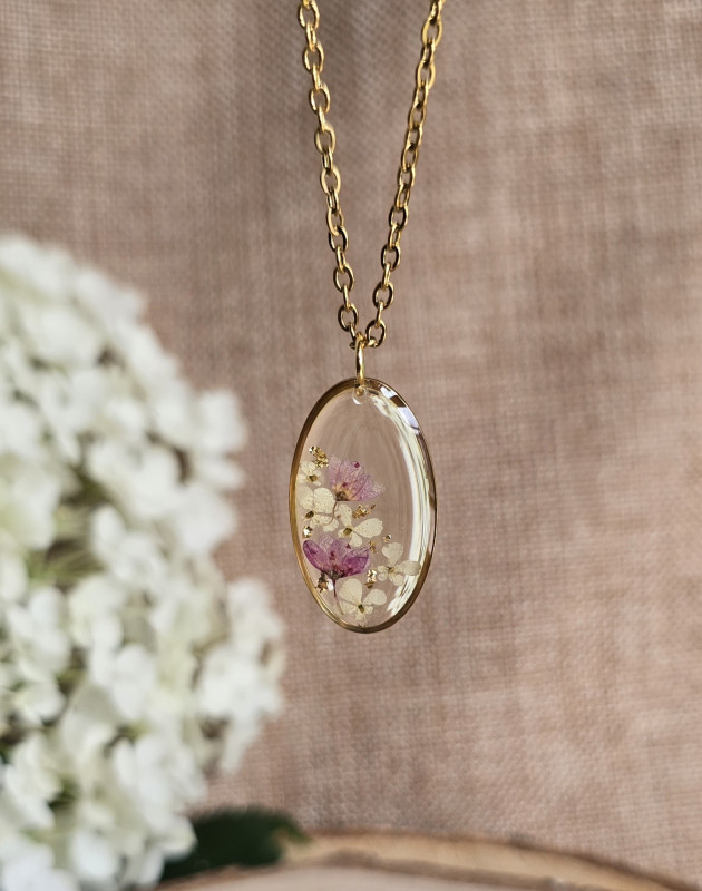 Oferuję Państwu unikalną biżuterię. Zawieszka jest wykonana z suszonych kwiatów i żywicy epoksydowej. Biżuteria jest wspaniałym i oryginalnym prezentem na lata. Do utrwalenia roślin stosuję żywicę jubilerską najwyższej jakości.