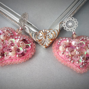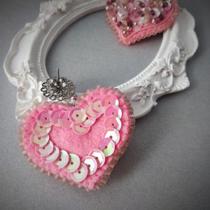 cekiny, koraliki szklane, stal nierdzewna (zapięcie), filc, nici, taśma cyrkoniowa