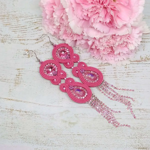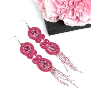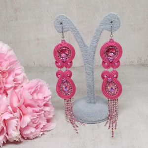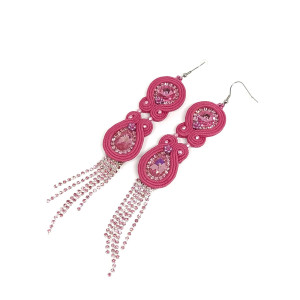 Te pełne blasku kolczyki są roziskrzone, lśniące i bardzo, ale to bardzo kobiece. Można powiedzieć, że to odrobina blasku zamknięta w kryształkach. Są idealne do wszelkich stylizacji w stylu glamour. Lśniące kryształy w kolorze różowym i delikatne kaskady maleńkich kryształków tworzą uroczą kombinację połączoną pasmami sutaszu w kolorze różowym.